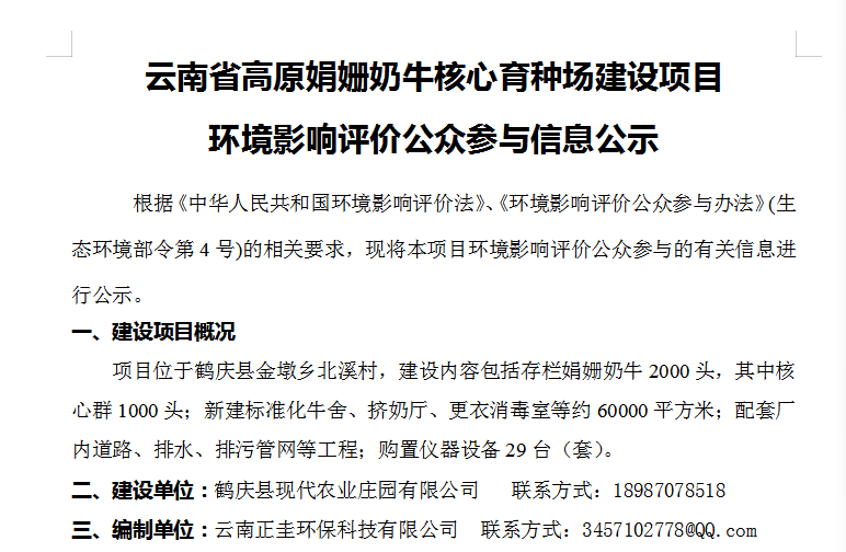 云南省高原娟姍奶牛核心育種場建設(shè)項(xiàng)目 環(huán)境影響評價(jià)公眾參與信息公示