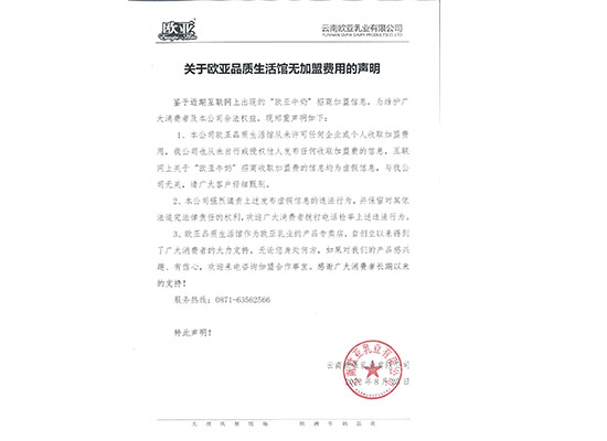 關(guān)于歐亞品質(zhì)生活館無加盟費(fèi)用的聲明